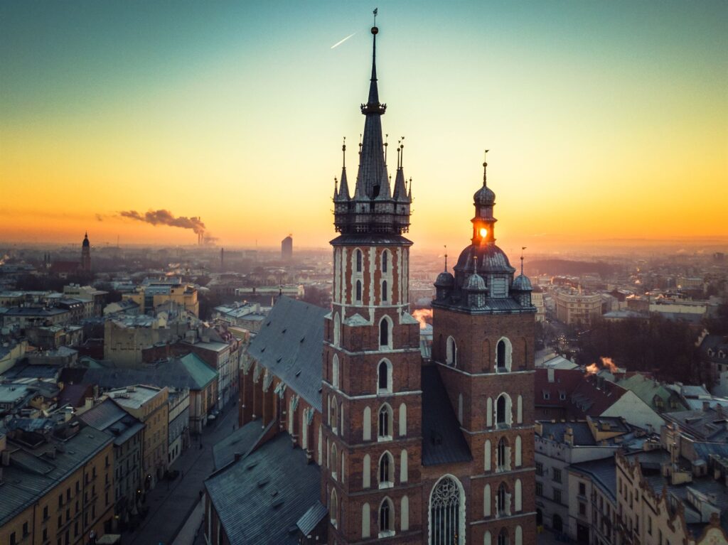 Kościół Mariacki to jeden z najważniejszych zabytków Krakowa, górujący nad Rynkiem Głównym swoimi charakterystycznymi wieżami. W jego wnętrzu znajduje się arcydzieło późnogotyckiej sztuki – imponujący ołtarz Wita Stwosza, przedstawiający sceny z życia Maryi. Co godzinę z wyższej wieży rozbrzmiewa hejnał mariacki, przerywany nagle na pamiątkę legendarnego trębacza. To miejsce o niezwykłej atmosferze i ogromnym znaczeniu historycznym.